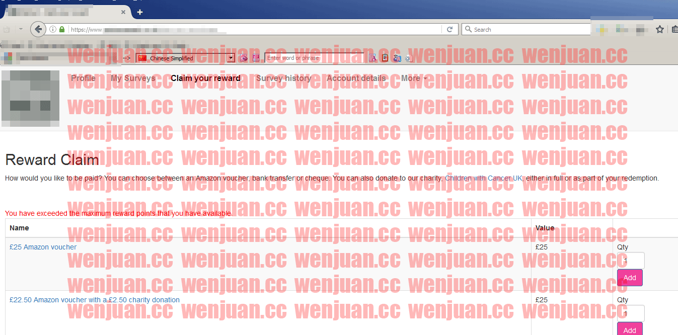 这是今天一位同学的聊天记录,关于请款提示You have exceeded the maximum reward points that you have available(你已经超过了可用的最大奖励点数)的问题,今天就这个问题给你们说一下,达到请款额度以后,到Claim your reward(领取奖励页面)点了Add(添加)按钮之后,需要到购物车点Redeem(兑换,一般翻译软件会直接翻译成赎回)按钮,这样才能成功请款,你才能收到问卷站的付款。这位同学是亚马逊请款,不管你是Paypal还是亚马逊卡请款基本都一样,添加之后都要到购物车点兑换按钮才能提交请款需求,然后你才能收到问卷站的付款。