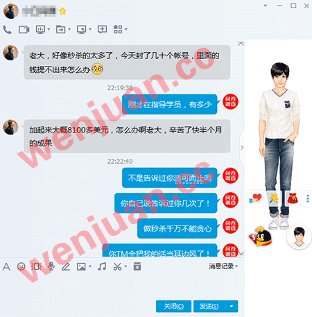 也许这就是我不愿意教学员秒杀的根本原因吧,今天一位老学员QQ上说自己的帐号封了几十个,对,没错,就是TM的老学员,也只有老学员才可以学习秒杀,可以对本人的提醒不在乎的老学员!做秒杀该说的该注意的,能做的不能做的都TM对老学员说的他们自己耳朵都烦了,还是有人不听!真的想骂人!!!